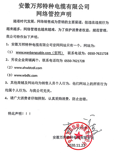 鄭重聲明:安徽萬邦特種電纜有限公司官方網站為:www_wanbangcable_com.hzrqwz.cn,除此之外無任何子網站或合作網站,其余均為假冒偽劣。電話:0550-7621728 13485756353 地 址:安徽省天長市滁州高新技術產業開發區經四路29號
